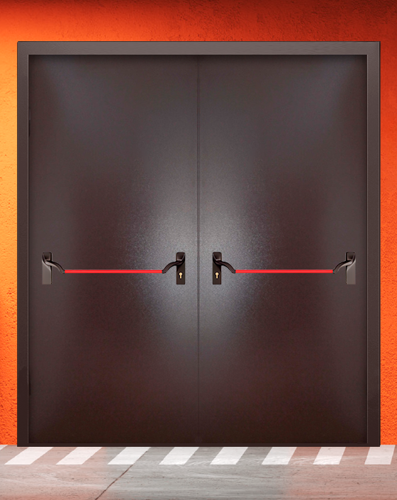 —Противопожарная двупольная коричневая дверь порошковым напылением EIWS 60 без доводчика с ручкой антипаника